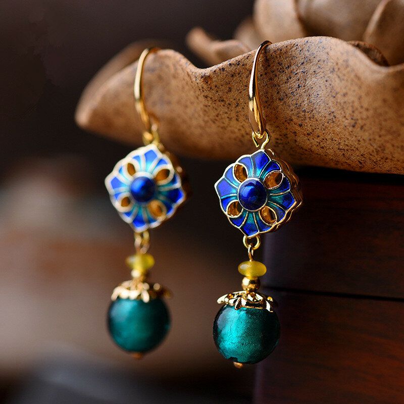 Luksuzne Retro Viseće Naušnice Cloisonne Cvijet Od Ahata Ručno Izrađene Zlatne Za Žene Etnički Nakit