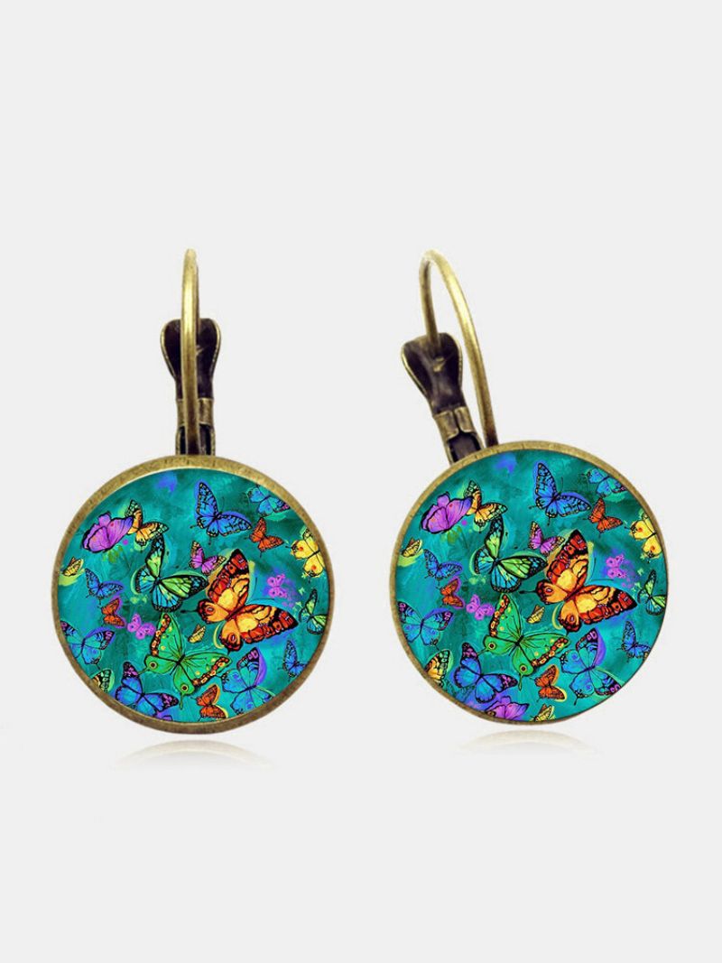 Vintage Okrugle Geometrijske Naušnice Od Legure Stakla Sa Šarenim Uzorkom Leptira