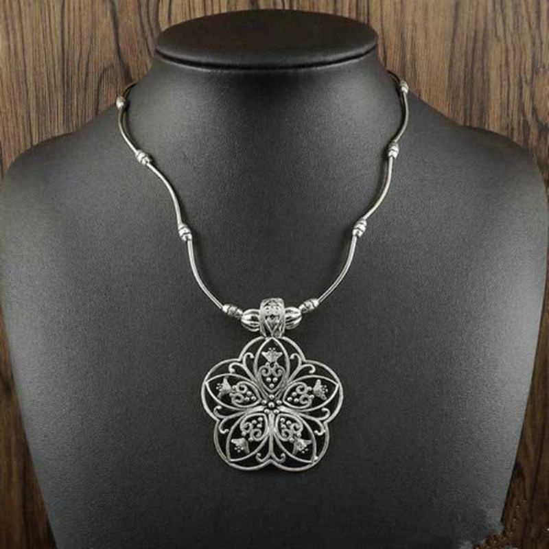 Vintage Starinska Srebrna Ogrlica S Privjeskom U Obliku Šupljeg Cvijeta Etnička Tibetanska Ženska S Puloverom