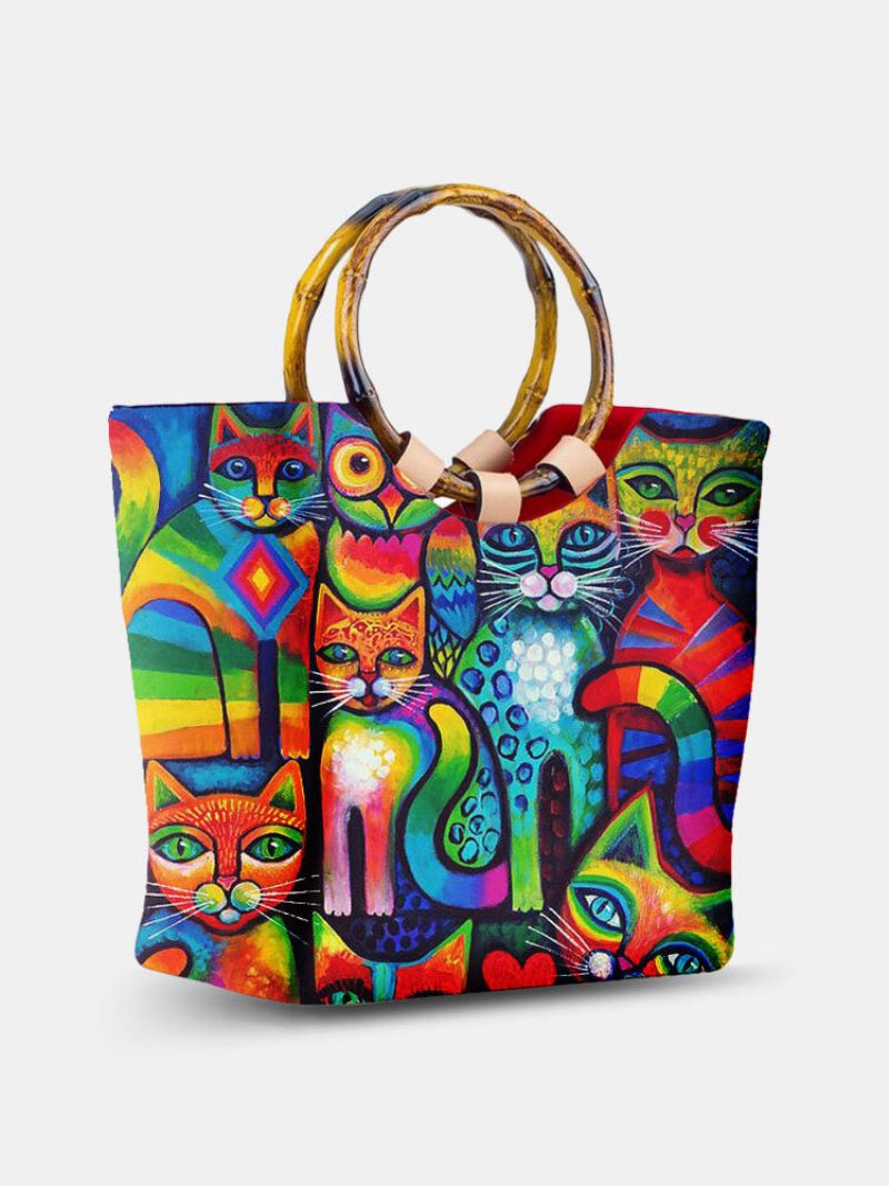 Ženska Ljetna Torbica Za Plažu Od Slame Šarenih Crtanih Mačkastih Uzoraka
